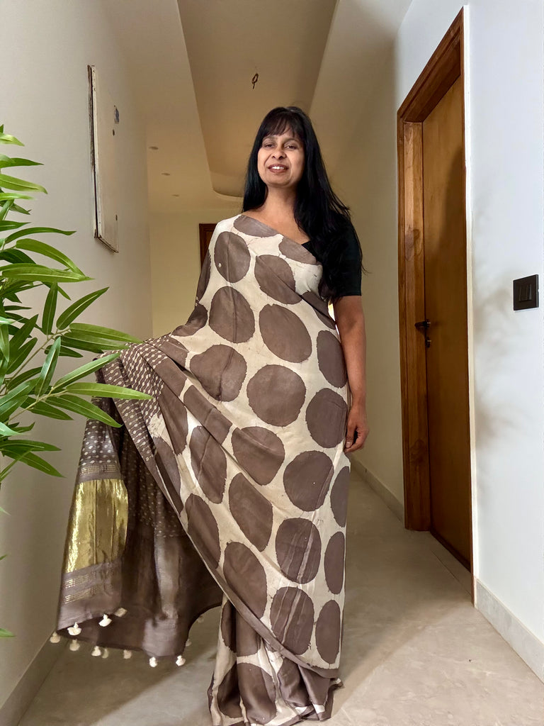 Saree: Crafted in rich modal silk, this is vanaspati (botanical) motifs handblock printed saree celebrates centuries of hand block printing tradition with fluid drape and luxurious comfort. Saree drapes like a dream. Timeless craft, made modern.