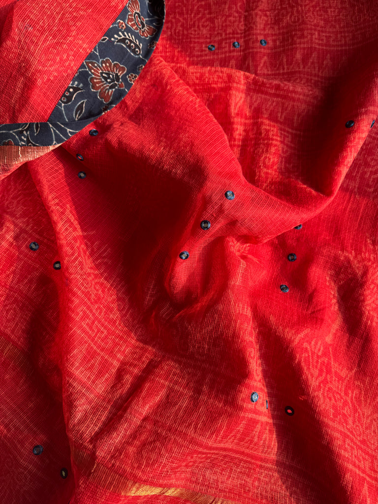 Saree : Enriched with an all-over hand block print, this saree is crafted from Kota cotton and comes with the cotton ajrakh fabric patchwork border.