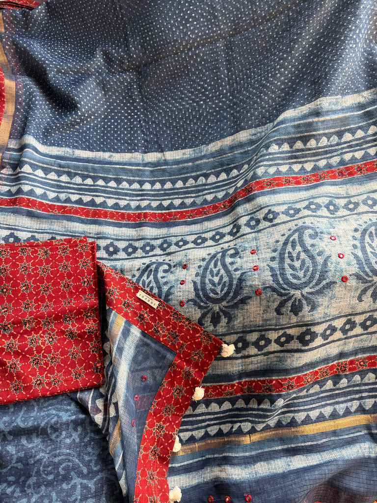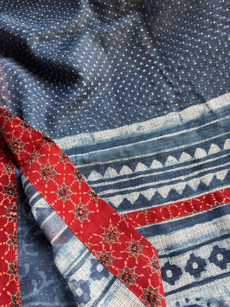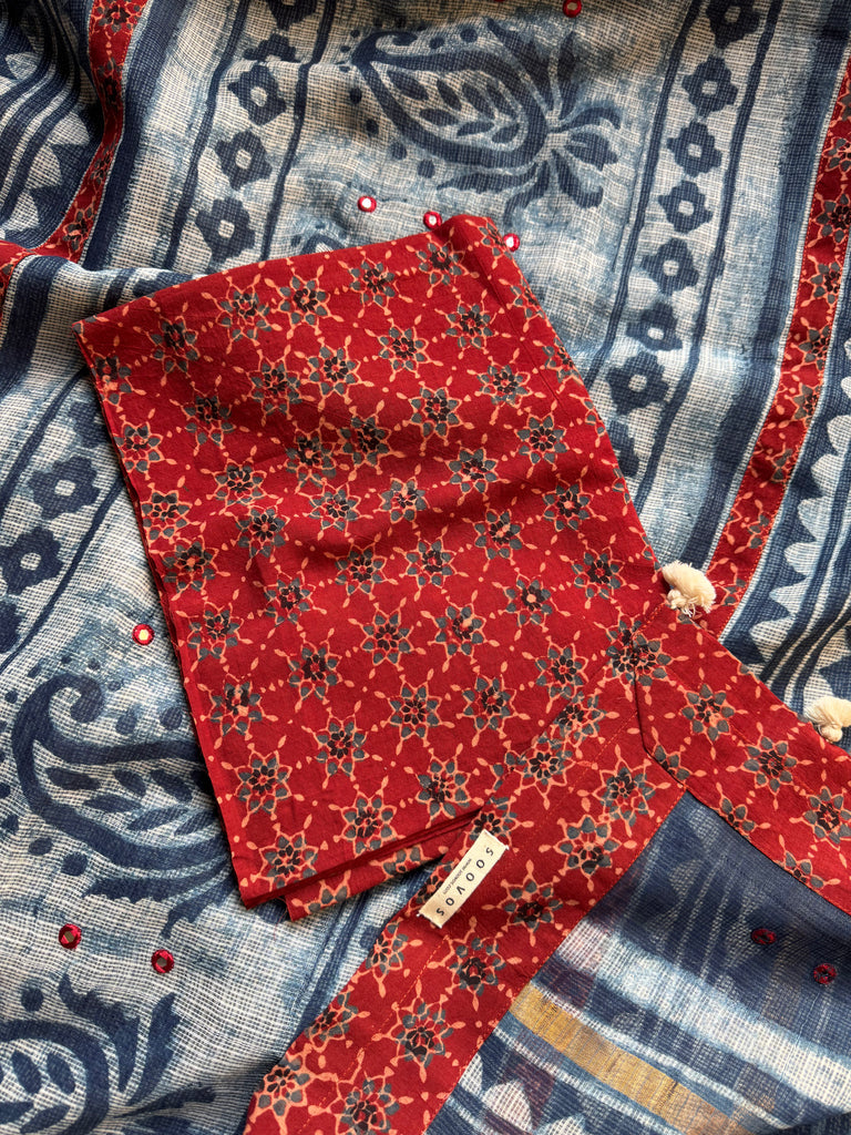 Saree : Enriched with an all-over hand block print, this saree is crafted from Kota cotton and comes with the Ajrakh cotton fabric patchwork border.