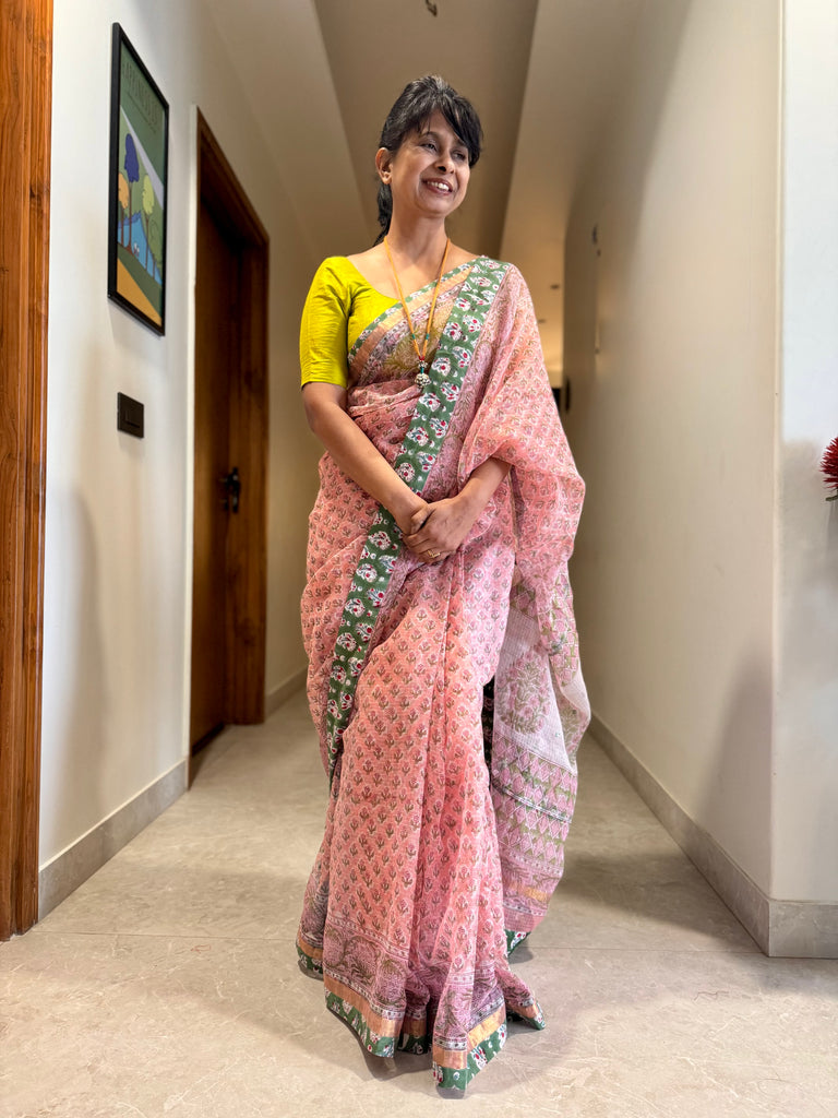 Saree : Enriched with an all-over hand block print, this saree is crafted from Kota cotton and comes with the hand block printed cotton fabric patchwork border.