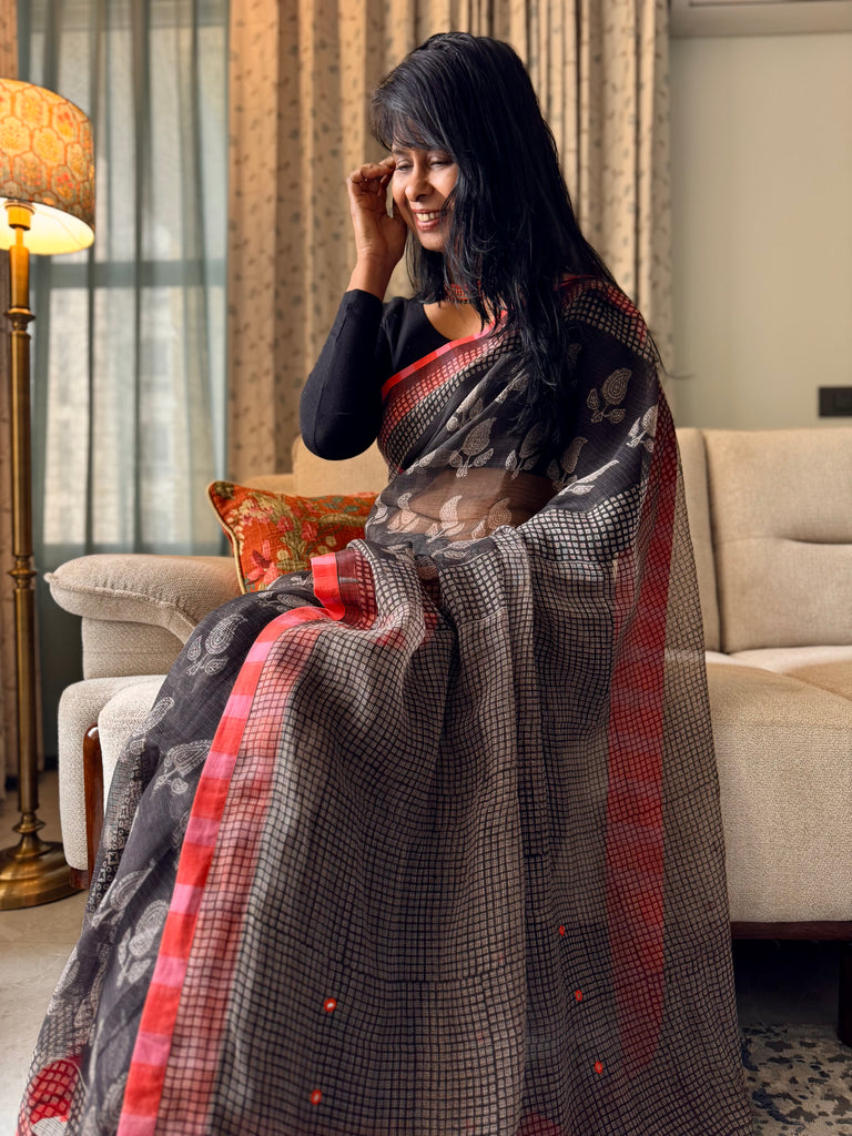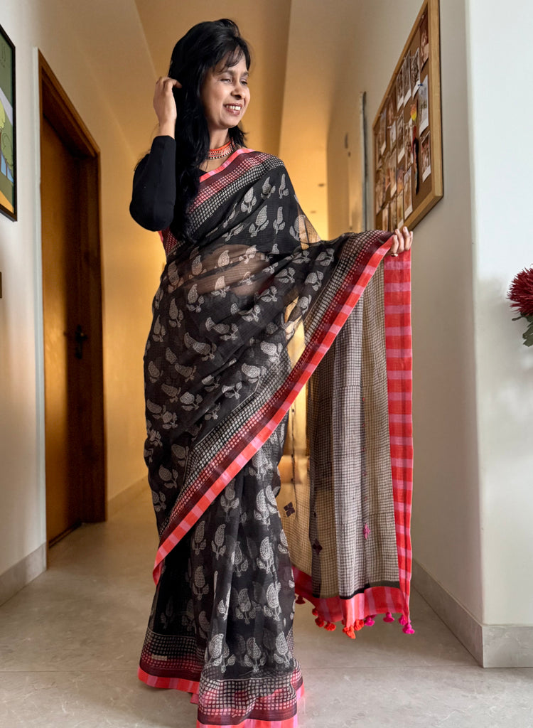 Saree : Enriched with an all-over hand block print, this saree is crafted from Kota cotton and comes with the hand block printed ajrakh cotton fabric patchwork border.