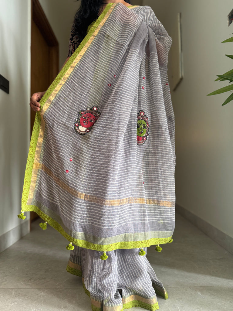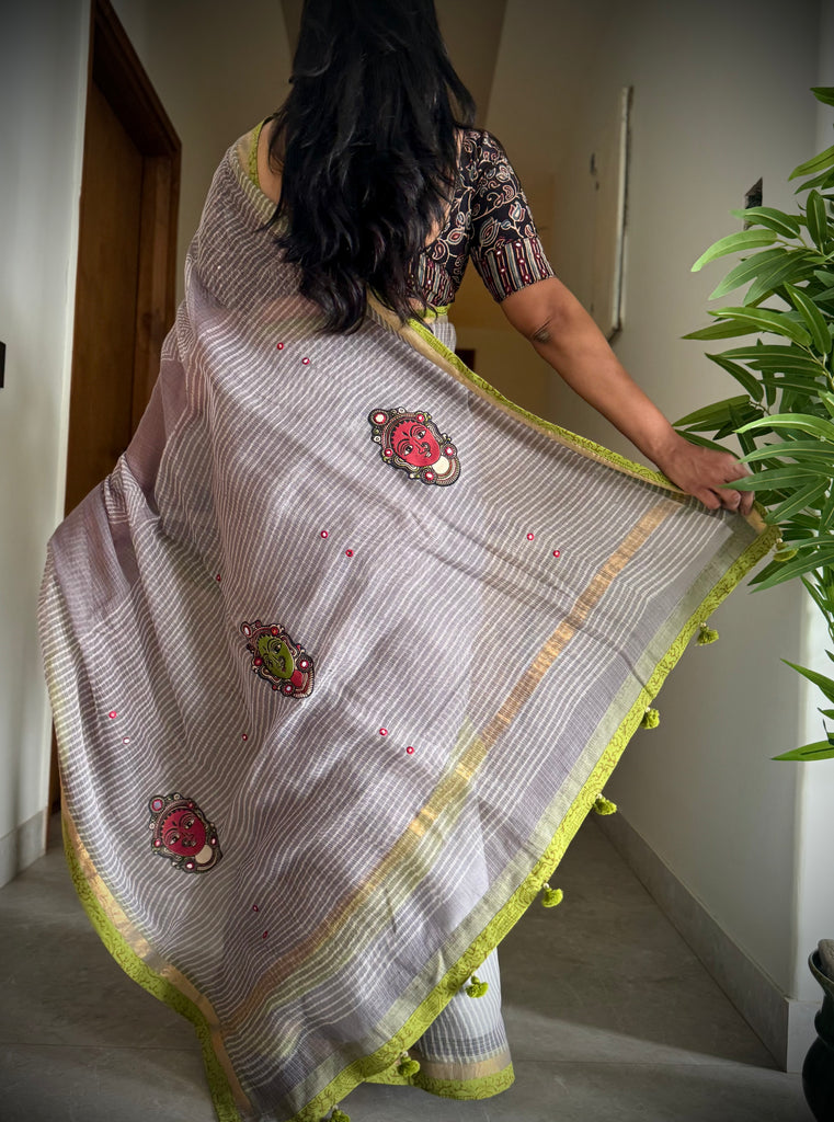 Embroidered pallu & patchwork border- kota doria saree