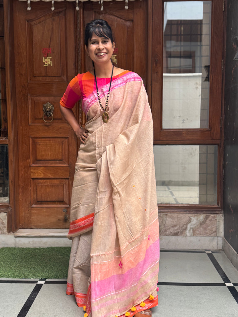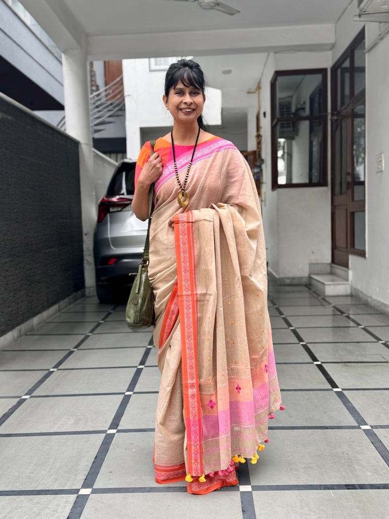 Woven Border Handloom cotton saree from West Bengal cluster .Subtle embroidery is done on pallu. Comes with hand made tassels on pallu.