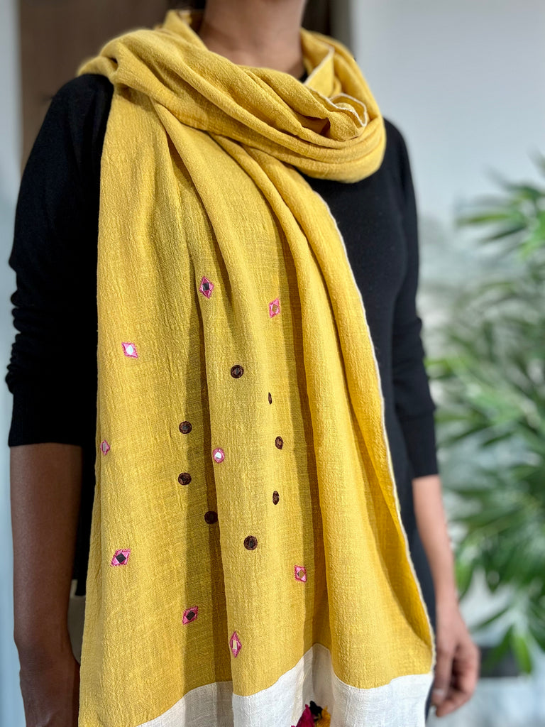 This zero-waste stole is made from leftover fabrics ( which we keep using for making sarees from big thaans), carefully put together with embroidery and stitching. By reusing fabric scraps, each stole becomes a unique, eco-friendly accessory that reflects the spirit of slow fashion.