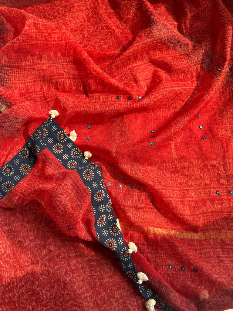 Saree : Enriched with an all-over hand block print, this saree is crafted from Kota cotton and comes with the cotton ajrakh fabric patchwork border.
