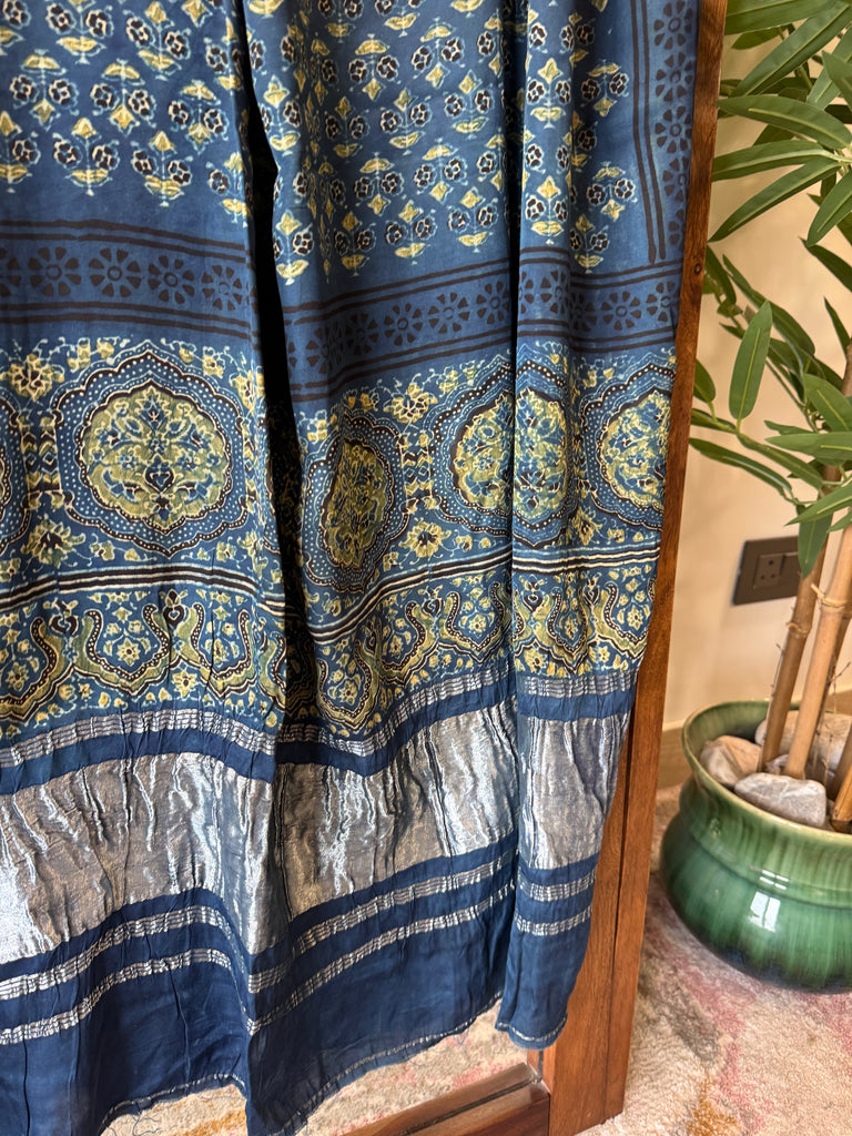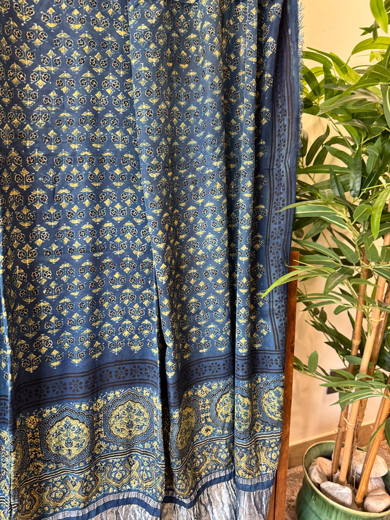 This Tissue Pallu Ajrakh Naturally Dyed Modal Silk Dupatta is crafted from soft, smooth, and flowy modal silk that drapes beautifully. It features traditional Ajrakh hand block prints made using natural dyes, reflecting rich heritage craftsmanship. The tissue pallu adds a gentle shimmer and festive touch, making it perfect for both special occasions and elegant everyday styling.