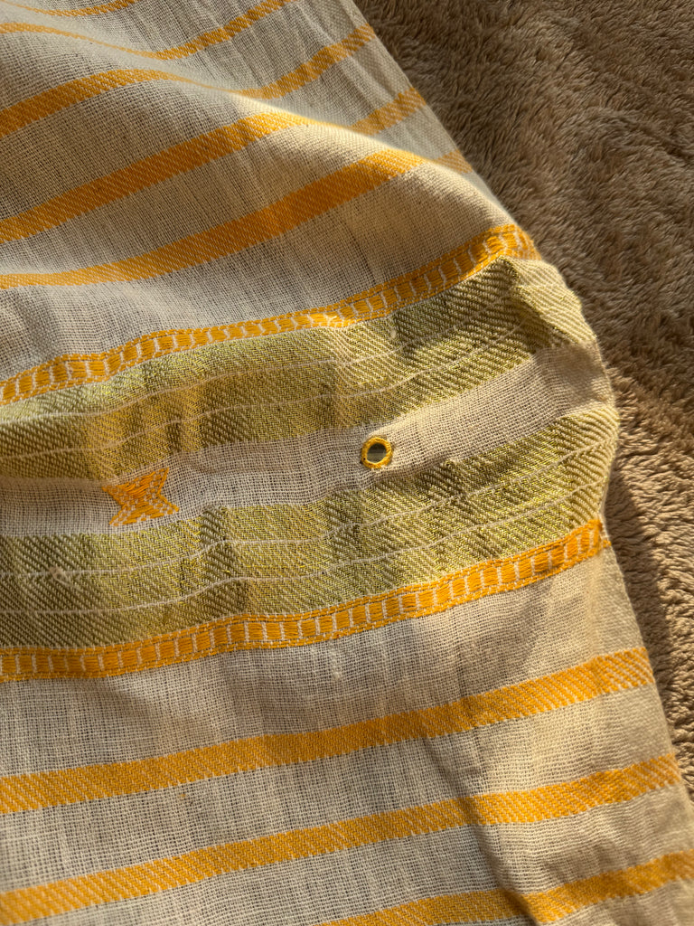 Each stole is then carefully handwoven in Bhujodi by Vankar Community, artisans patiently working on pit looms, interlacing every thread with precision and rhythm. The subtle patterns and textures emerge slowly, reflecting the weaver’s skill and years of inherited craftsmanship.
