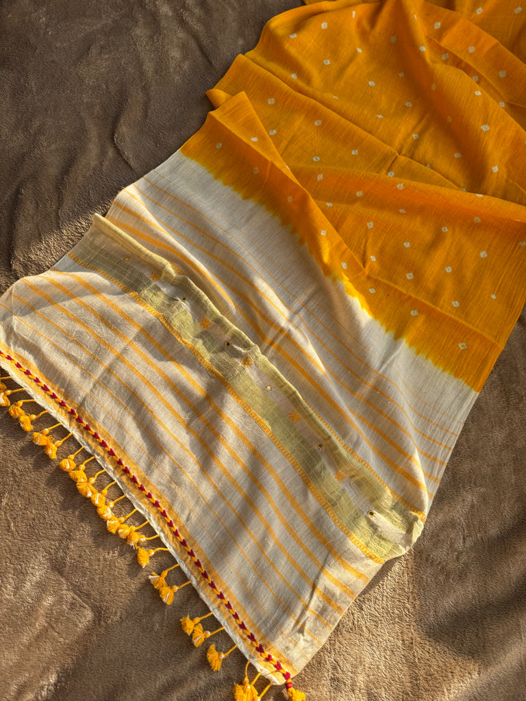 Where Bandhani artistry meets Bhujodi weaving — vibrant hand-tied patterns come together with earthy handloom textures, creating a stole that beautifully blends color, craft, and heritage.