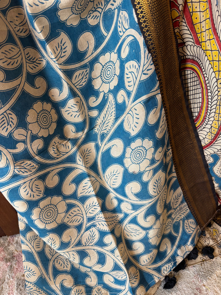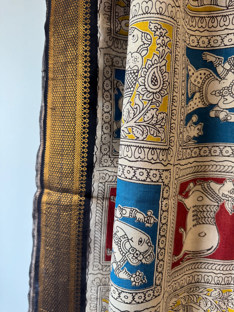 Inspired by ancient stories and reimagined in print, this Kalamkari cotton saree brings handcrafted charm to your wardrobe. With breathable fabric and timeless motifs, it’s the art you wear, every day.