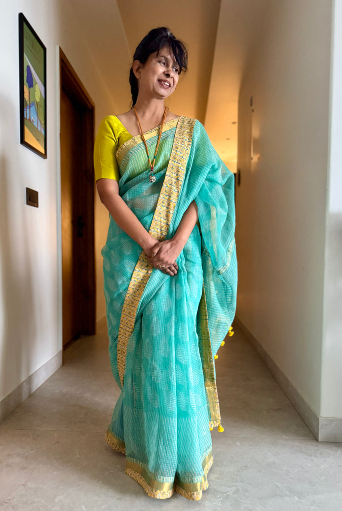 Embroidered pallu & patchwork border- kota doria saree
