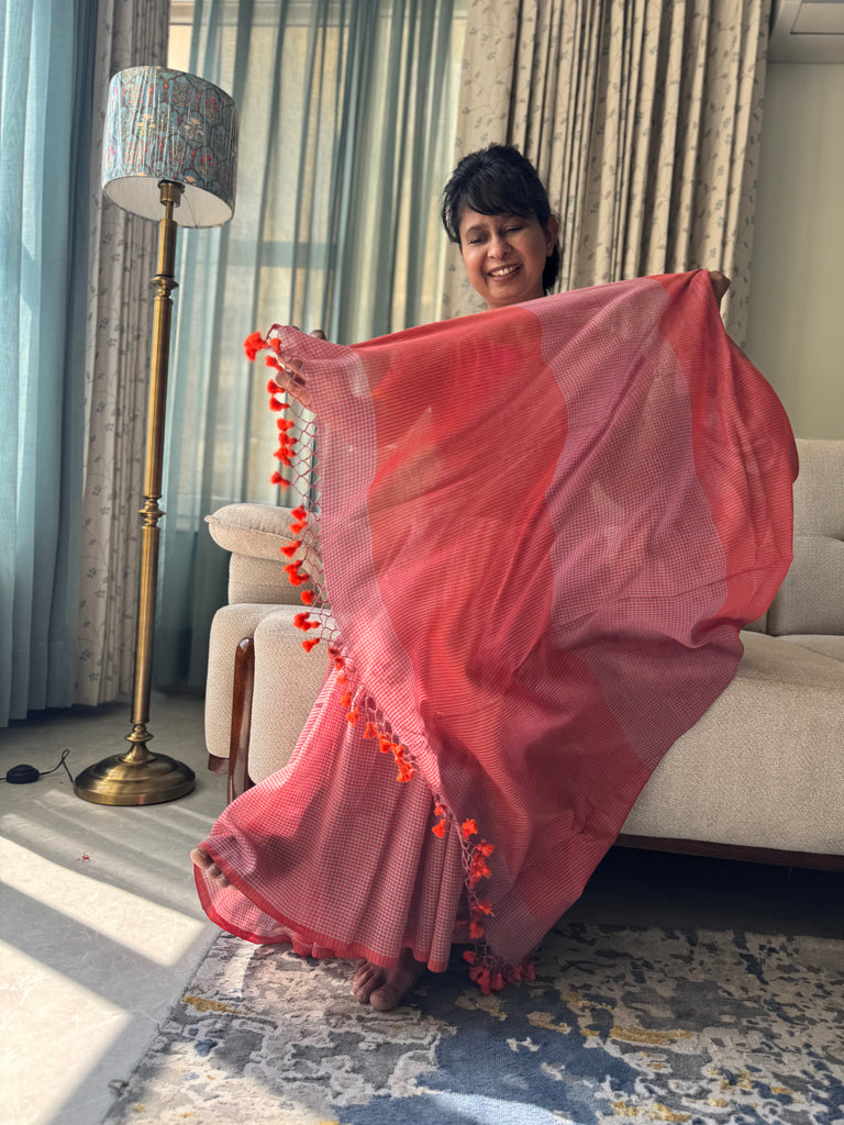 Handloom cotton saree from West Bengal cluster . Comes with hand made tassels on pallu.
