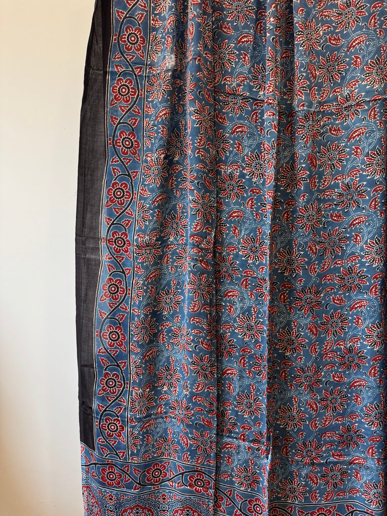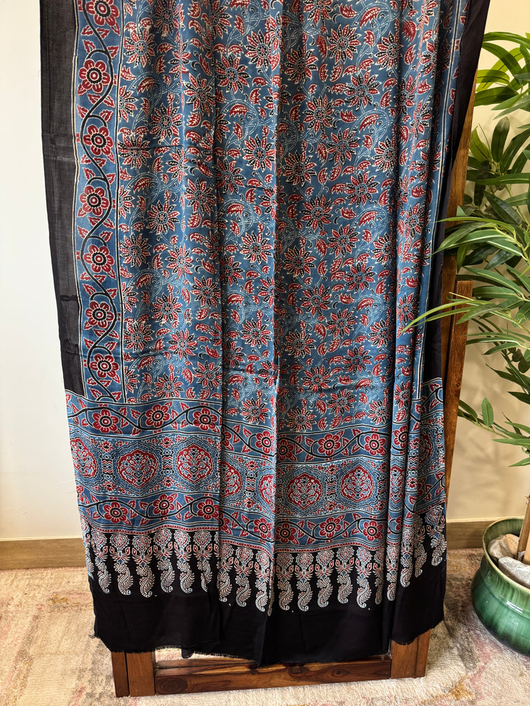 Ajrakh naturally dyed block printed dupatta in modal silk with geometrical patterns using indigo, madder, black and white - all vegetable dyes.