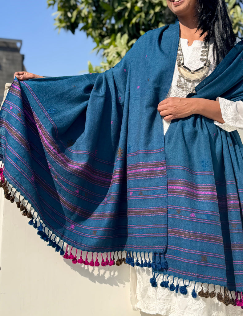 Blue - Kutch Bhujodi Handwoven Merino Wool Shawl, Very Soft
