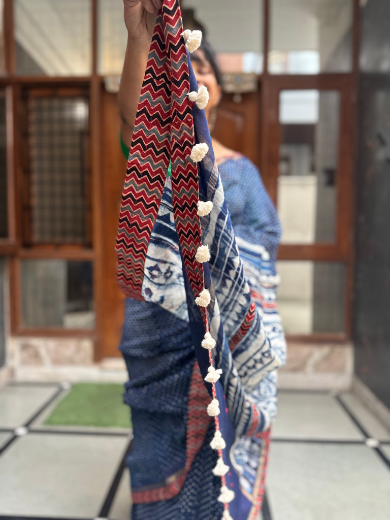 Embroidered Pallu & Ajrakh Patchwork Border- Cotton Silk Block printed Saree