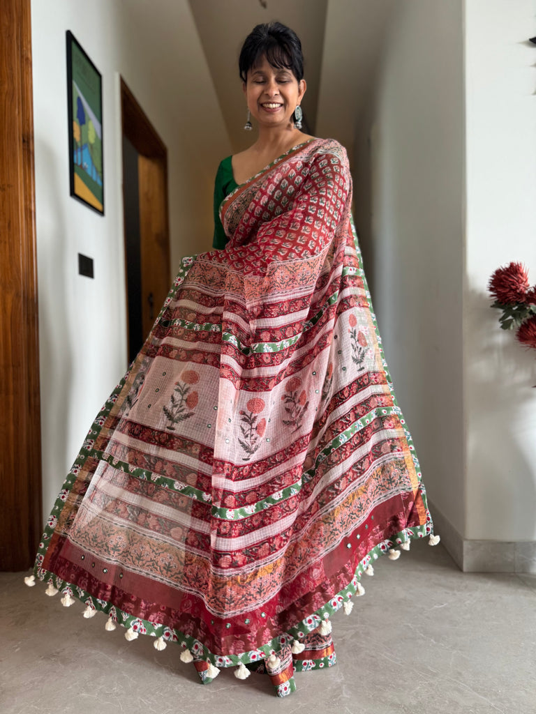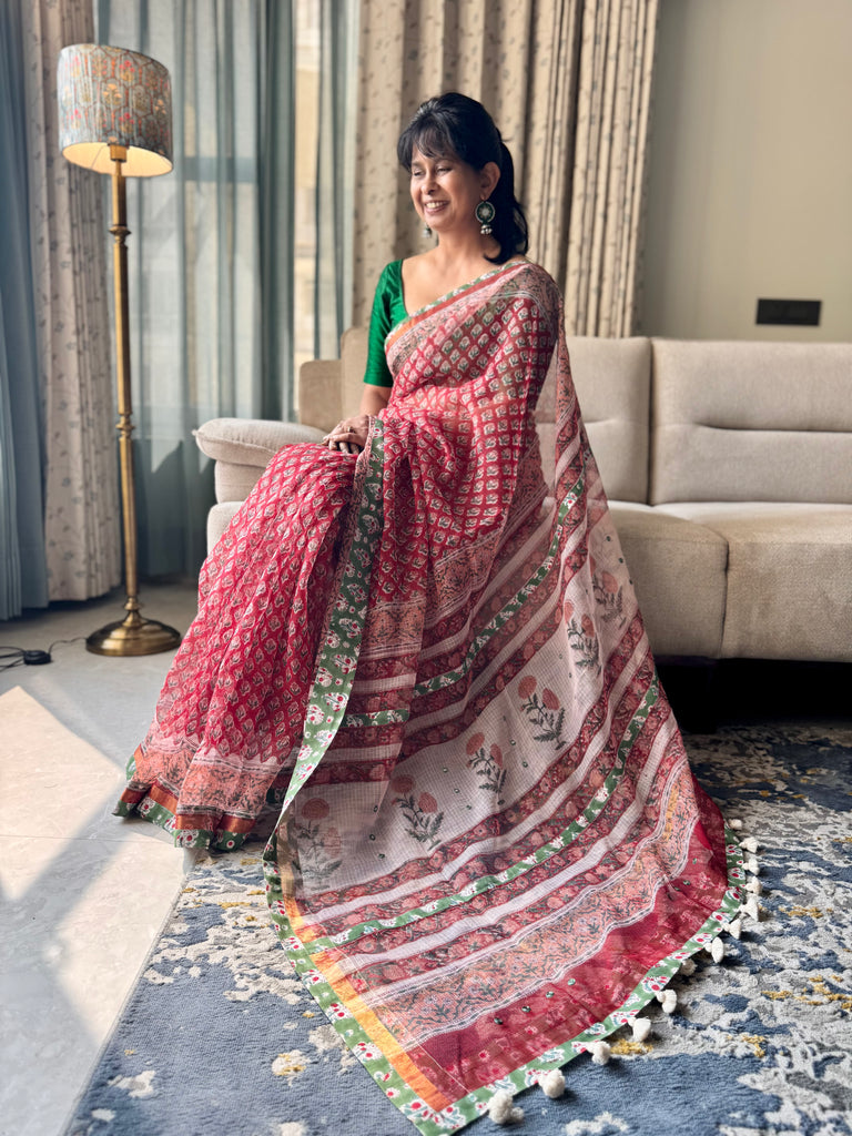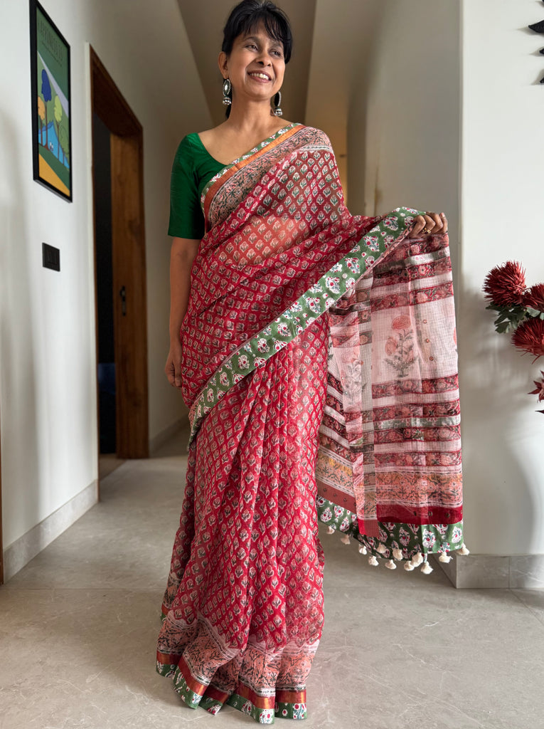 Saree : Enriched with an all-over hand block print, this saree is crafted from Kota cotton and comes with the block printed cotton fabric patchwork border.
