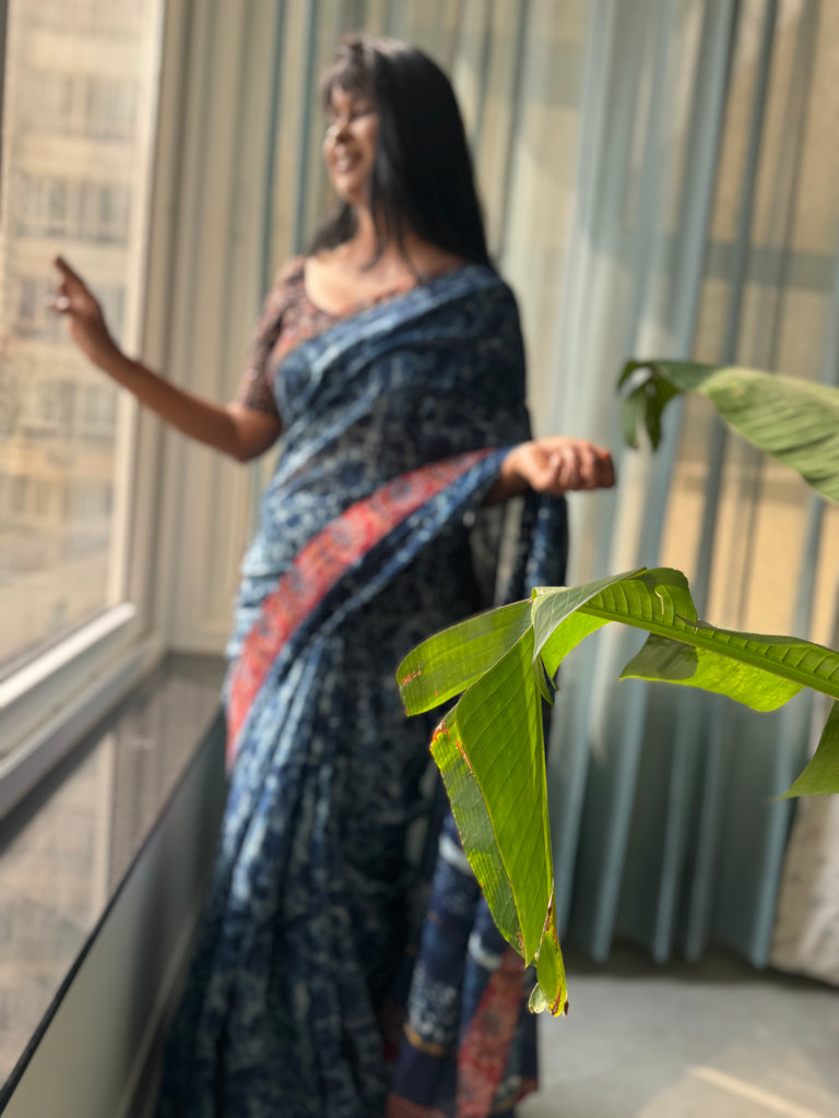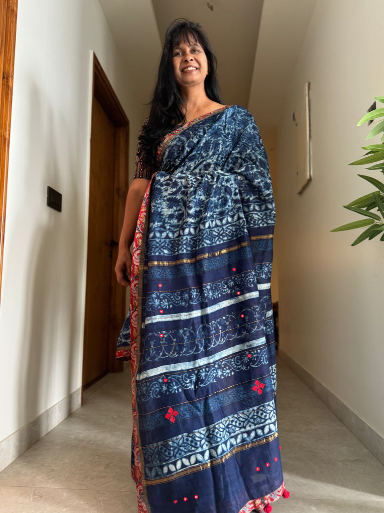 Embroidered Pallu & Kalamkari Patchwork Border- Cotton Silk Block Printed Saree
