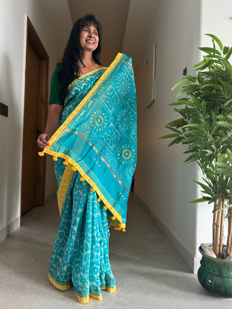 Embroidered Pallu & Soft Ikkat Patchwork Border- Cotton Silk Block Printed Saree