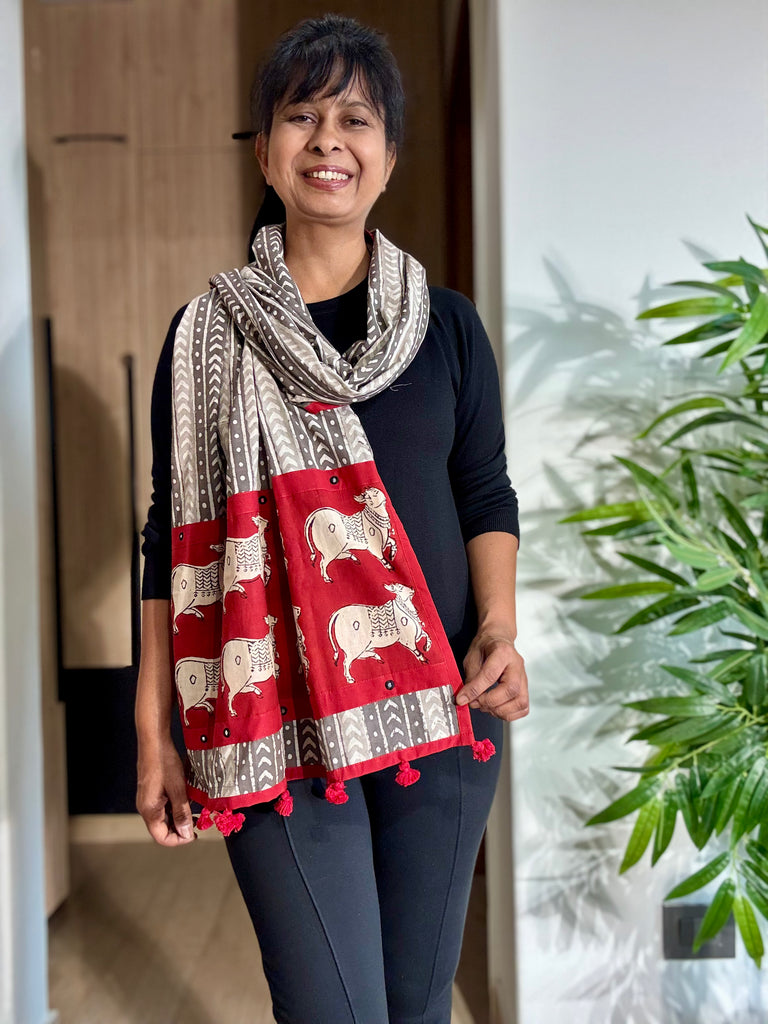 This zero-waste patchwork stole is made from leftover fabrics, carefully put together with embroidery and stitching. By reusing fabric scraps, each stole becomes a unique, eco-friendly accessory that reflects the spirit of slow fashion.